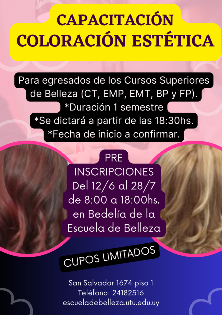 Capacitación Coloración Estética Publicación de la entrada:6 de junio de 2023 También podría gustarte Exámenes pendientes 17 de noviembre de 2023 Taller de Estilismo Artístico 28 de agosto de 2024 Resultados examen M.S.P. Masajes 5 de junio de 2023